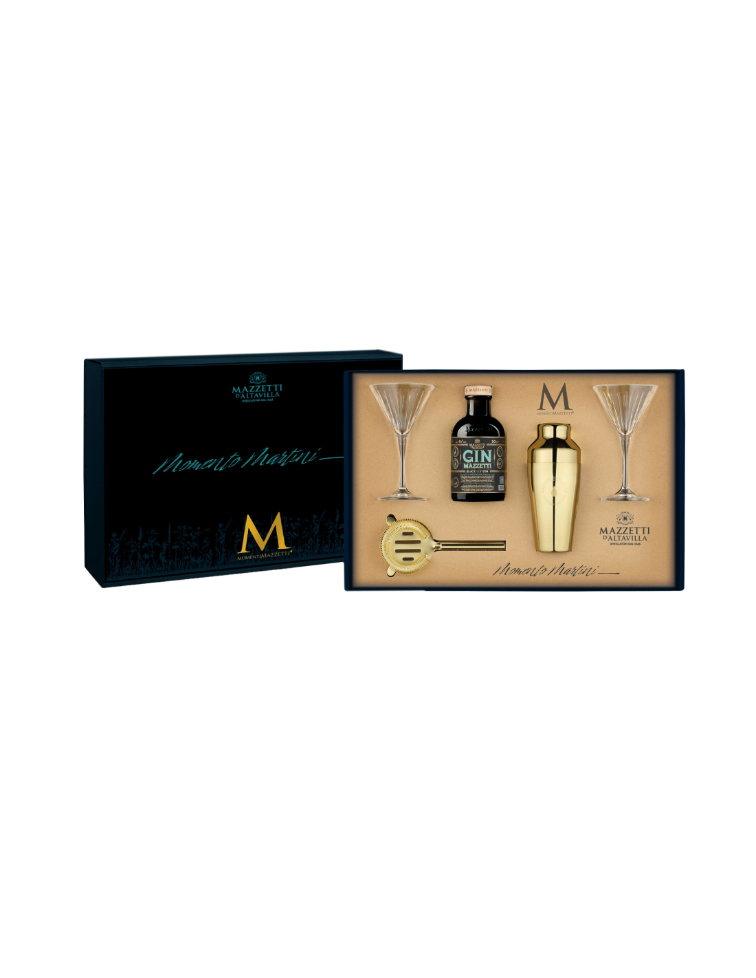 GIN MAZZETTI BLACK EDITION CON 2 BICCHIERI MARTINI, GOLDEN BOSTON E STRAINER. Un semplice cocktail? Il Martini è molto di più, e con la sua storia, fatta di tanti sorsi, ha conquistato intere generazioni resistendo per tanti decenni all’inesorabile evoluzione delle tendenze. Il Momento Martini è un inno al celebre drink, racchiudendo nella stessa confezione tutto il necessario per la sua preparazione, a cominciare dal Gin Mazzetti Black Edition. Calici, shaker… per pregustare le inconfondibili note dell’icona della miscelazione. Non manca nulla.